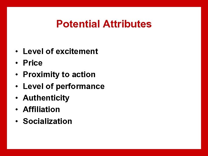 Potential Attributes • • Level of excitement Price Proximity to action Level of performance Authenticity Affiliation Socialization
