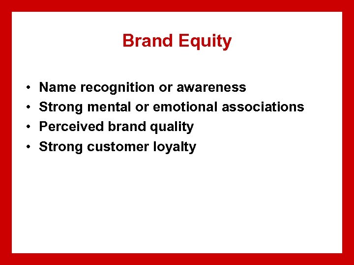 Brand Equity • • Name recognition or awareness Strong mental or emotional associations Perceived brand quality Strong customer loyalty