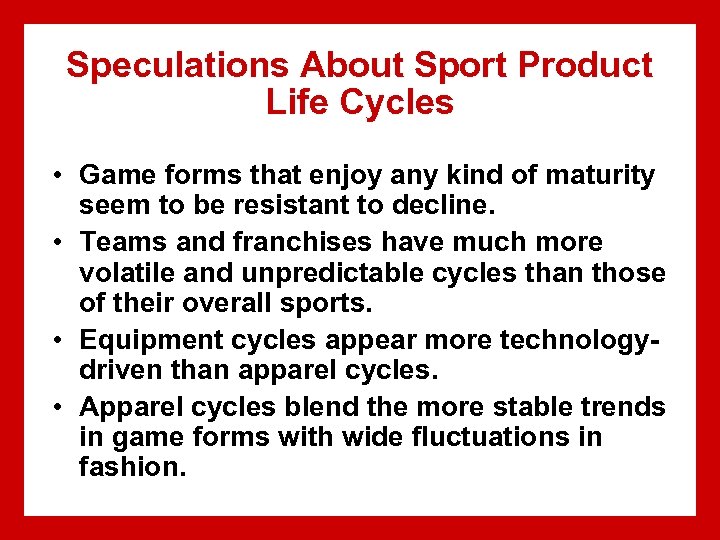 Speculations About Sport Product Life Cycles • Game forms that enjoy any kind of maturity seem to be resistant to decline. • Teams and franchises have much more volatile and unpredictable cycles than those of their overall sports. • Equipment cycles appear more technologydriven than apparel cycles. • Apparel cycles blend the more stable trends in game forms with wide fluctuations in fashion.