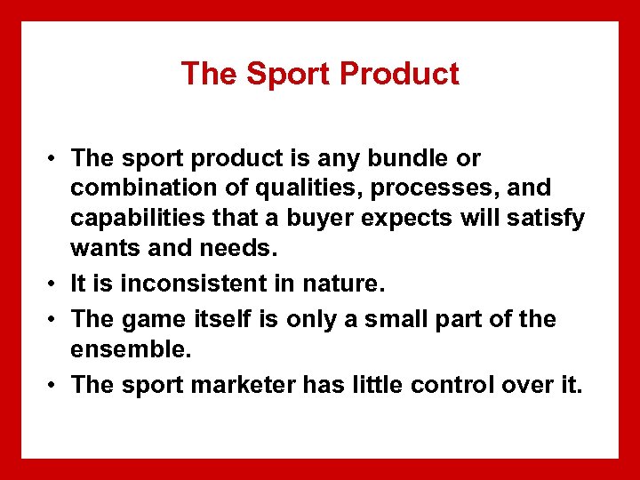 The Sport Product • The sport product is any bundle or combination of qualities, processes, and capabilities that a buyer expects will satisfy wants and needs. • It is inconsistent in nature. • The game itself is only a small part of the ensemble. • The sport marketer has little control over it.
