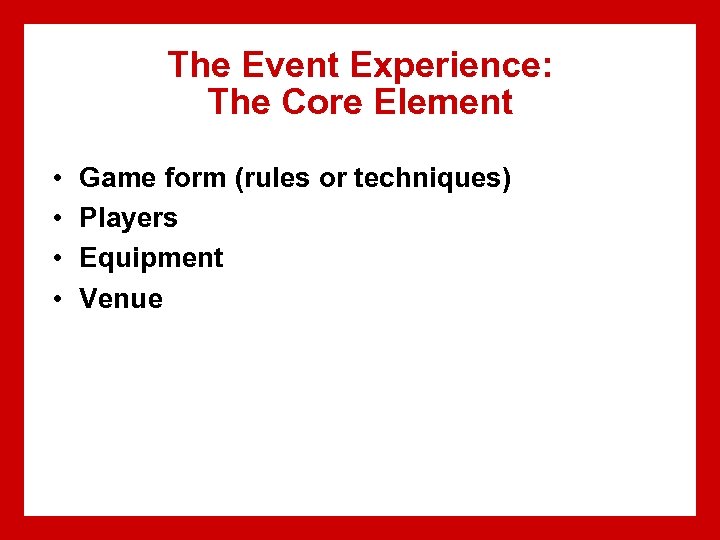 The Event Experience: The Core Element • • Game form (rules or techniques) Players Equipment Venue