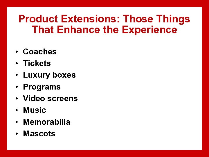 Product Extensions: Those Things That Enhance the Experience • • Coaches Tickets Luxury boxes Programs Video screens Music Memorabilia Mascots