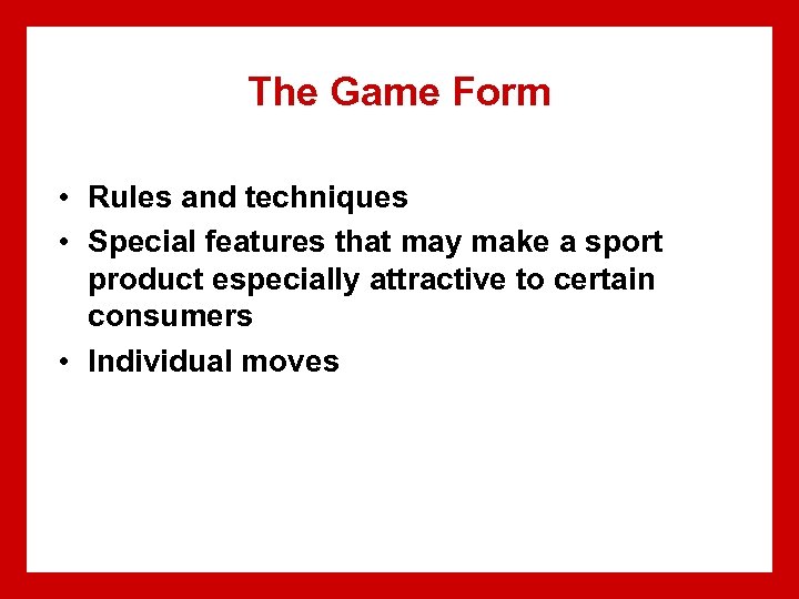 The Game Form • Rules and techniques • Special features that may make a sport product especially attractive to certain consumers • Individual moves