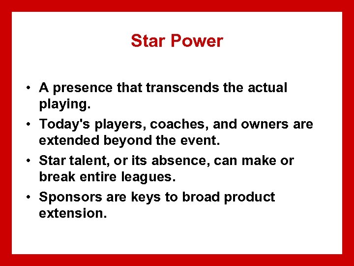 Star Power • A presence that transcends the actual playing. • Today's players, coaches, and owners are extended beyond the event. • Star talent, or its absence, can make or break entire leagues. • Sponsors are keys to broad product extension.