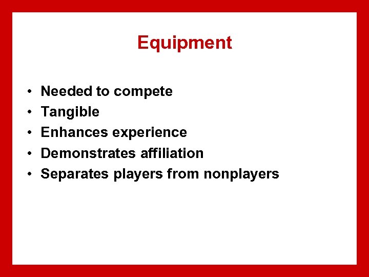 Equipment • • • Needed to compete Tangible Enhances experience Demonstrates affiliation Separates players from nonplayers