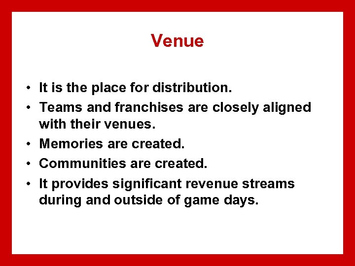 Venue • It is the place for distribution. • Teams and franchises are closely aligned with their venues. • Memories are created. • Communities are created. • It provides significant revenue streams during and outside of game days.