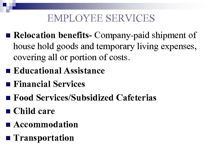 EMPLOYEE SERVICES Relocation benefits- Company-paid shipment of house hold goods and temporary living expenses, covering all or portion of costs. n Educational Assistance n Financial Services n Food Services/Subsidized Cafeterias n Child care n Accommodation n Transportation n