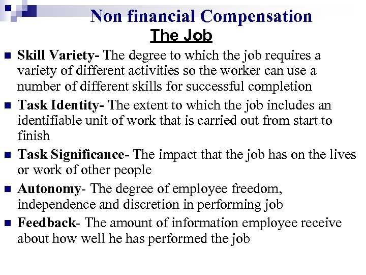 Non financial Compensation The Job n n n Skill Variety- The degree to which the job requires a variety of different activities so the worker can use a number of different skills for successful completion Task Identity- The extent to which the job includes an identifiable unit of work that is carried out from start to finish Task Significance- The impact that the job has on the lives or work of other people Autonomy- The degree of employee freedom, independence and discretion in performing job Feedback- The amount of information employee receive about how well he has performed the job