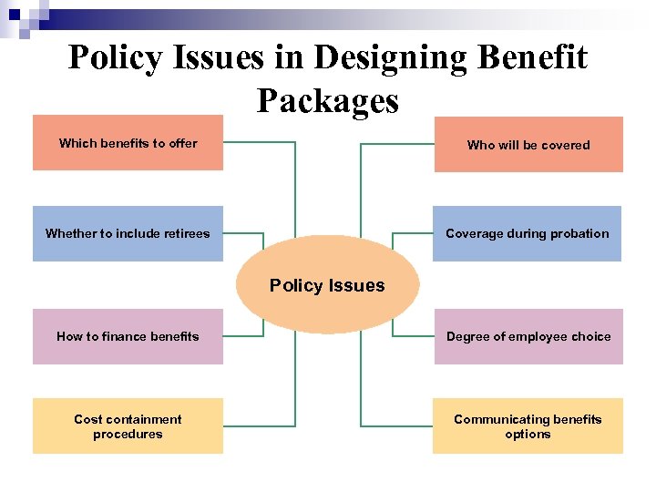 Policy Issues in Designing Benefit Packages Which benefits to offer Who will be covered Whether to include retirees Coverage during probation Policy Issues How to finance benefits Degree of employee choice Cost containment procedures Communicating benefits options