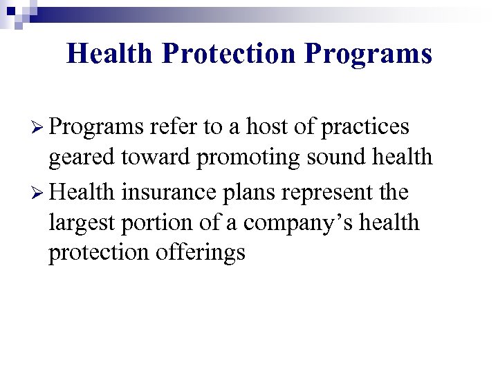 Health Protection Programs Ø Programs refer to a host of practices geared toward promoting sound health Ø Health insurance plans represent the largest portion of a company’s health protection offerings