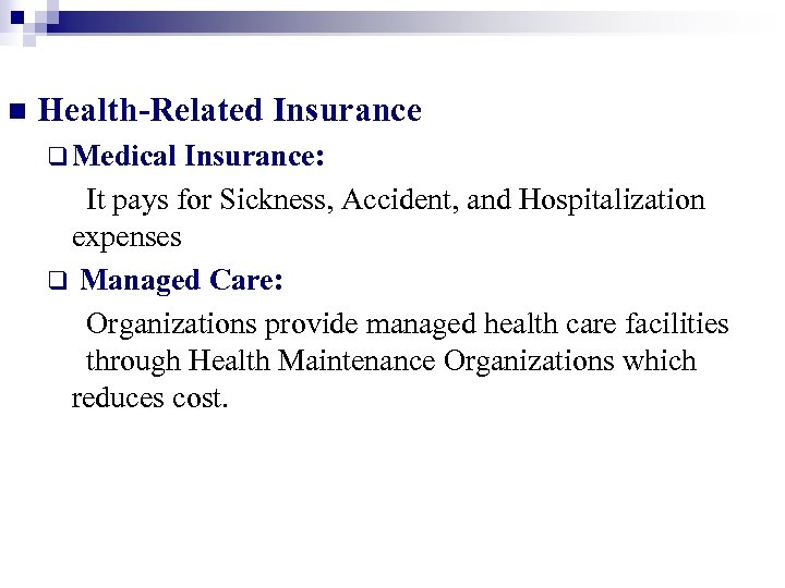 n Health-Related Insurance q Medical Insurance: It pays for Sickness, Accident, and Hospitalization expenses q Managed Care: Organizations provide managed health care facilities through Health Maintenance Organizations which reduces cost.