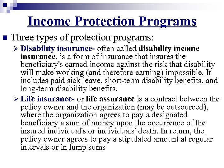 Income Protection Programs n Three types of protection programs: Ø Disability insurance- often called disability income insurance, is a form of insurance that insures the beneficiary's earned income against the risk that disability will make working (and therefore earning) impossible. It includes paid sick leave, short-term disability benefits, and long-term disability benefits. Ø Life insurance- or life assurance is a contract between the policy owner and the organization (may be outsourced), where the organization agrees to pay a designated beneficiary a sum of money upon the occurrence of the insured individual's or individuals' death. In return, the policy owner agrees to pay a stipulated amount at regular intervals or in lump sums
