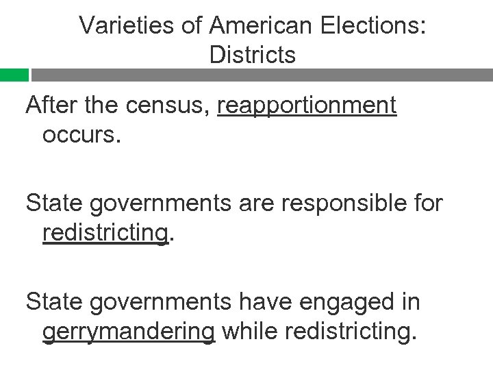 Varieties of American Elections: Districts After the census, reapportionment occurs. State governments are responsible for redistricting. State governments have engaged in gerrymandering while redistricting.