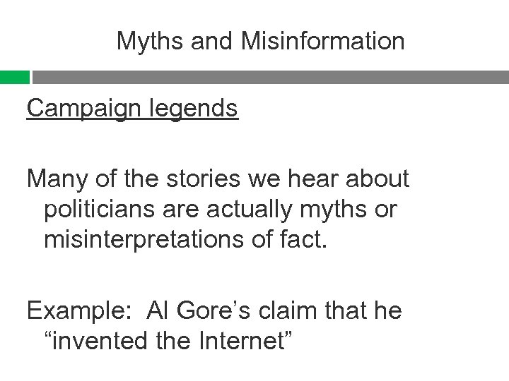 Myths and Misinformation Campaign legends Many of the stories we hear about politicians are actually myths or misinterpretations of fact. Example: Al Gore’s claim that he “invented the Internet”