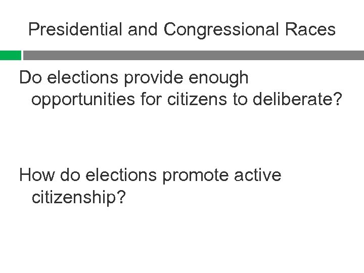 Presidential and Congressional Races Do elections provide enough opportunities for citizens to deliberate? How do elections promote active citizenship?