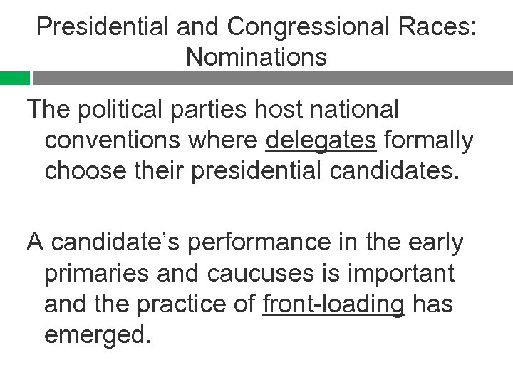 Presidential and Congressional Races: Nominations The political parties host national conventions where delegates formally choose their presidential candidates. A candidate’s performance in the early primaries and caucuses is important and the practice of front-loading has emerged.
