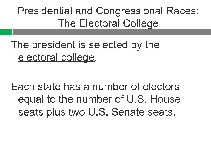 Presidential and Congressional Races: The Electoral College The president is selected by the electoral college. Each state has a number of electors equal to the number of U. S. House seats plus two U. S. Senate seats.