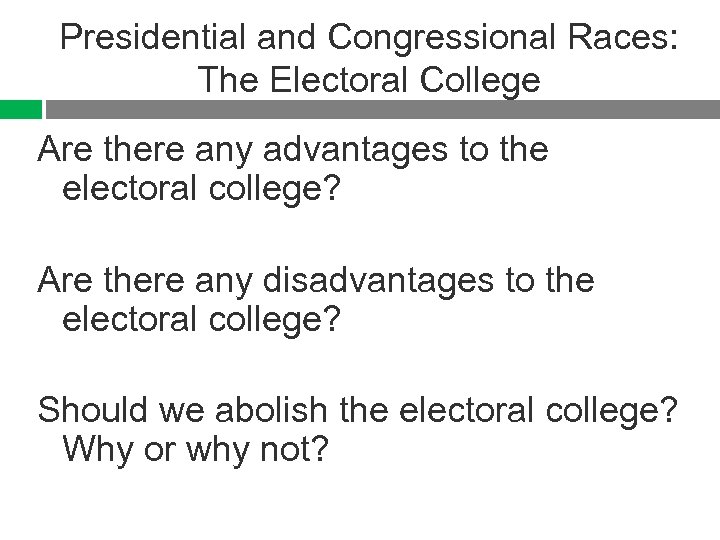 Presidential and Congressional Races: The Electoral College Are there any advantages to the electoral college? Are there any disadvantages to the electoral college? Should we abolish the electoral college? Why or why not?