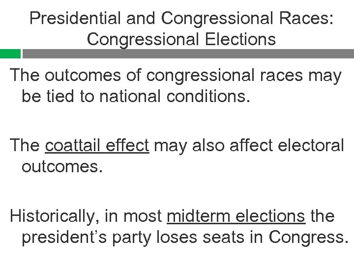 Presidential and Congressional Races: Congressional Elections The outcomes of congressional races may be tied to national conditions. The coattail effect may also affect electoral outcomes. Historically, in most midterm elections the president’s party loses seats in Congress.
