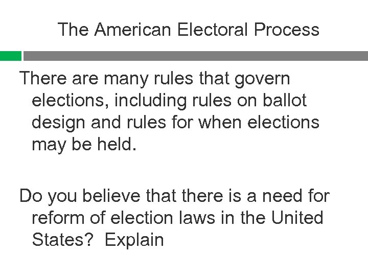 The American Electoral Process There are many rules that govern elections, including rules on ballot design and rules for when elections may be held. Do you believe that there is a need for reform of election laws in the United States? Explain