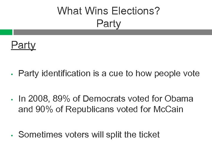 What Wins Elections? Party • • • Party identification is a cue to how people vote In 2008, 89% of Democrats voted for Obama and 90% of Republicans voted for Mc. Cain Sometimes voters will split the ticket