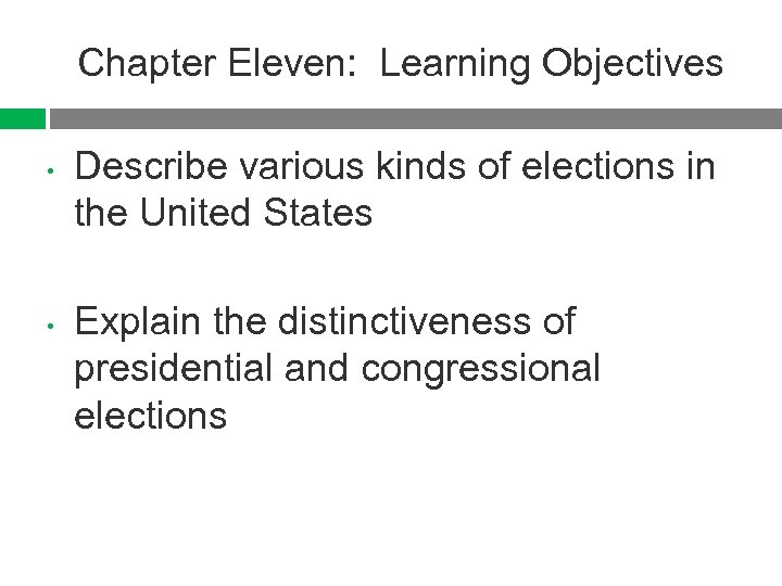 Chapter Eleven: Learning Objectives • • Describe various kinds of elections in the United States Explain the distinctiveness of presidential and congressional elections