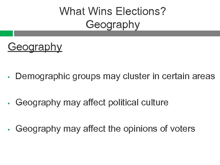 What Wins Elections? Geography • Demographic groups may cluster in certain areas • Geography may affect political culture • Geography may affect the opinions of voters