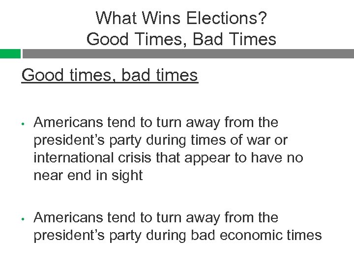 What Wins Elections? Good Times, Bad Times Good times, bad times • • Americans tend to turn away from the president’s party during times of war or international crisis that appear to have no near end in sight Americans tend to turn away from the president’s party during bad economic times