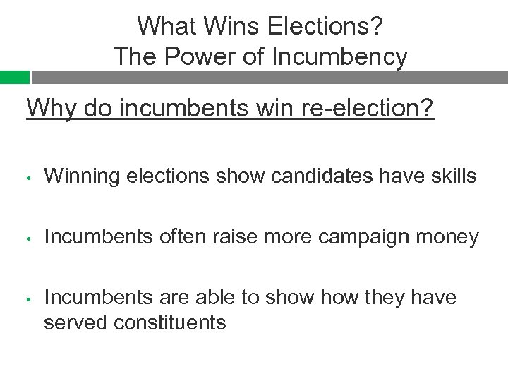 What Wins Elections? The Power of Incumbency Why do incumbents win re-election? • Winning elections show candidates have skills • Incumbents often raise more campaign money • Incumbents are able to show they have served constituents