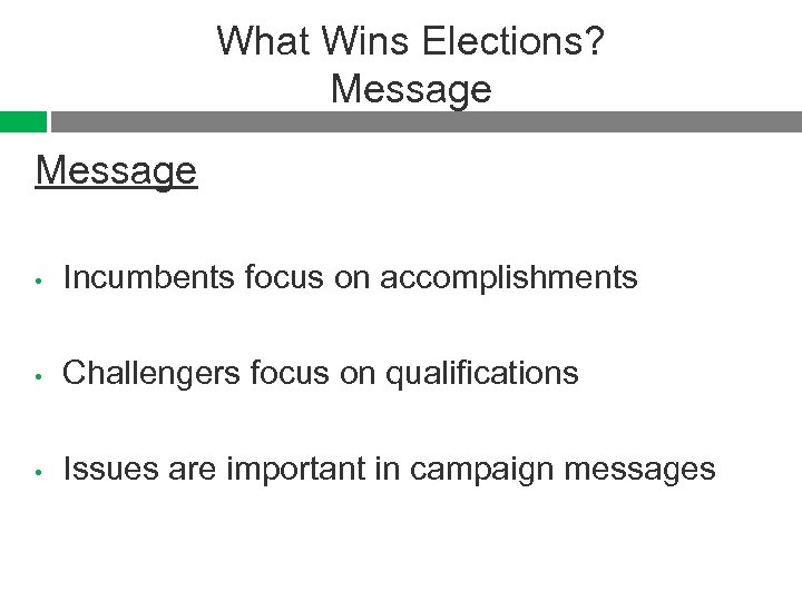 What Wins Elections? Message • Incumbents focus on accomplishments • Challengers focus on qualifications • Issues are important in campaign messages