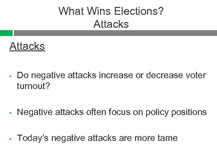 What Wins Elections? Attacks • Do negative attacks increase or decrease voter turnout? • Negative attacks often focus on policy positions • Today’s negative attacks are more tame