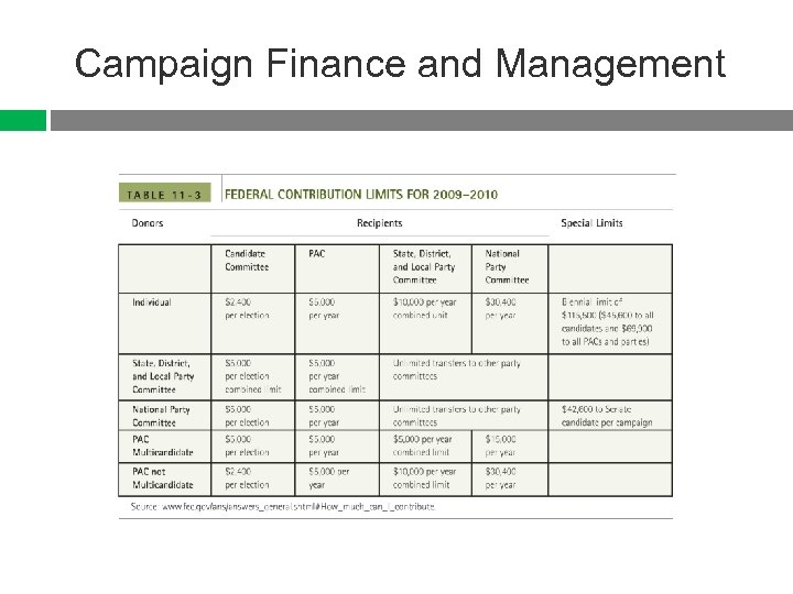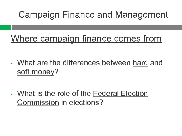 Campaign Finance and Management Where campaign finance comes from • • What are the differences between hard and soft money? What is the role of the Federal Election Commission in elections?