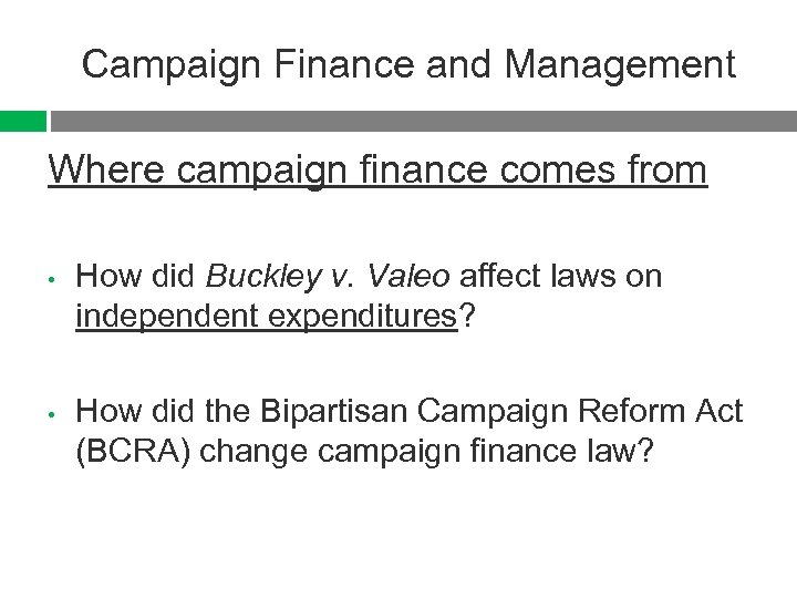 Campaign Finance and Management Where campaign finance comes from • • How did Buckley v. Valeo affect laws on independent expenditures? How did the Bipartisan Campaign Reform Act (BCRA) change campaign finance law?