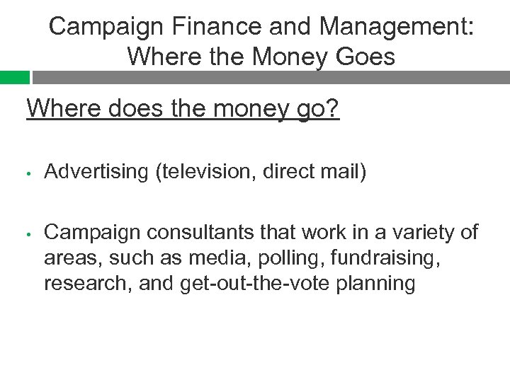 Campaign Finance and Management: Where the Money Goes Where does the money go? • • Advertising (television, direct mail) Campaign consultants that work in a variety of areas, such as media, polling, fundraising, research, and get-out-the-vote planning