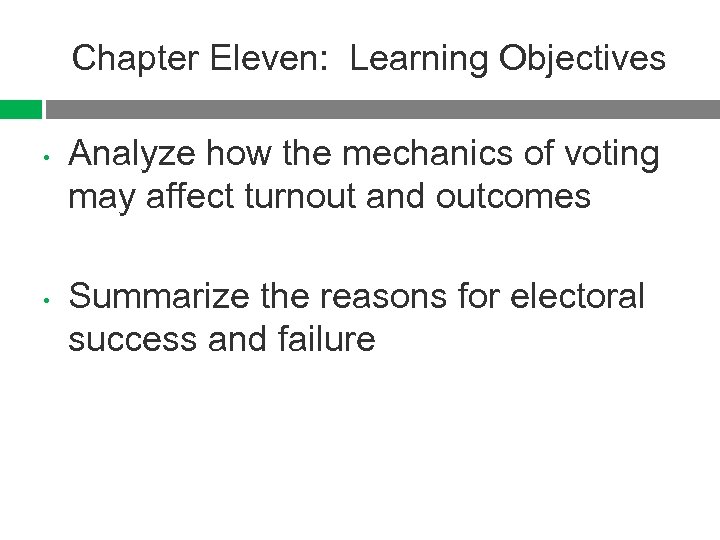 Chapter Eleven: Learning Objectives • • Analyze how the mechanics of voting may affect turnout and outcomes Summarize the reasons for electoral success and failure