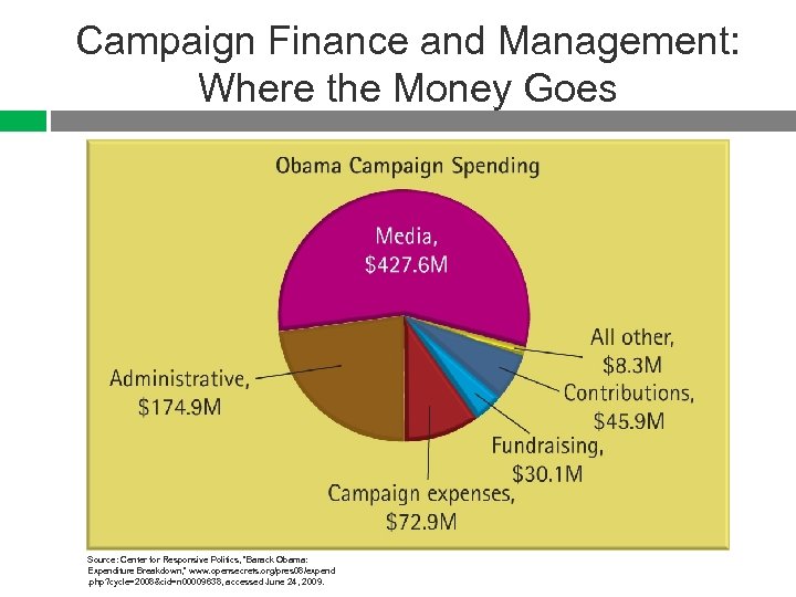 Campaign Finance and Management: Where the Money Goes Source: Center for Responsive Politics, “Barack Obama: Expenditure Breakdown, ” www. opensecrets. org/pres 08/expend. php? cycle=2008&cid=n 00009638, accessed June 24, 2009.