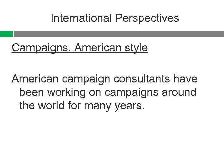International Perspectives Campaigns, American style American campaign consultants have been working on campaigns around the world for many years.