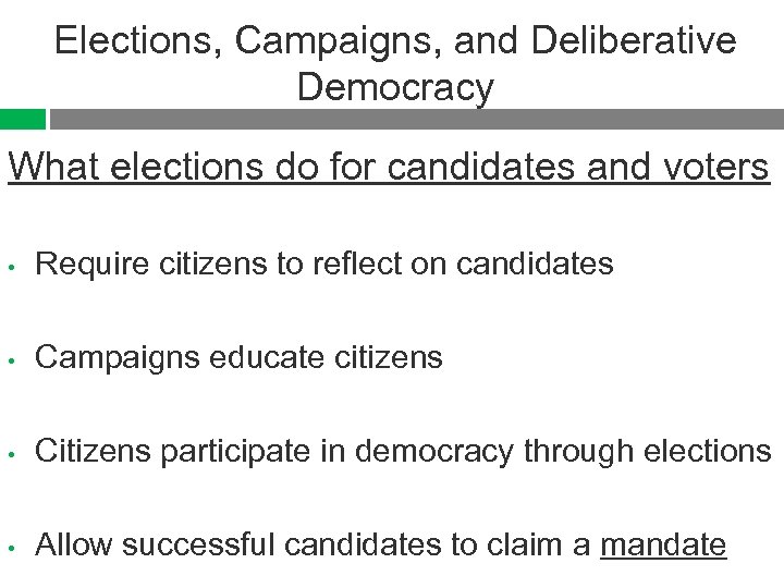 Elections, Campaigns, and Deliberative Democracy What elections do for candidates and voters • Require citizens to reflect on candidates • Campaigns educate citizens • Citizens participate in democracy through elections • Allow successful candidates to claim a mandate