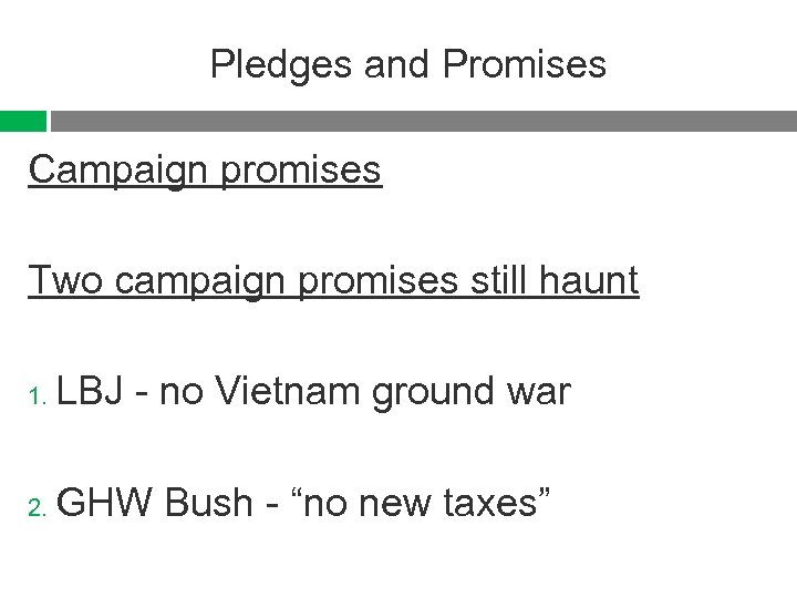 Pledges and Promises Campaign promises Two campaign promises still haunt 1. LBJ - no Vietnam ground war 2. GHW Bush - “no new taxes”