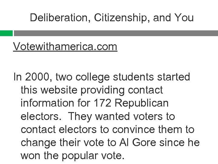 Deliberation, Citizenship, and You Votewithamerica. com In 2000, two college students started this website providing contact information for 172 Republican electors. They wanted voters to contact electors to convince them to change their vote to Al Gore since he won the popular vote.