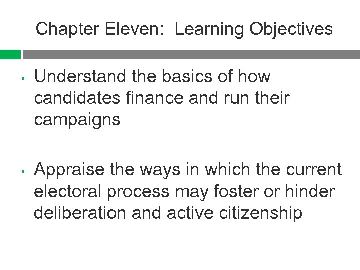 Chapter Eleven: Learning Objectives • • Understand the basics of how candidates finance and run their campaigns Appraise the ways in which the current electoral process may foster or hinder deliberation and active citizenship