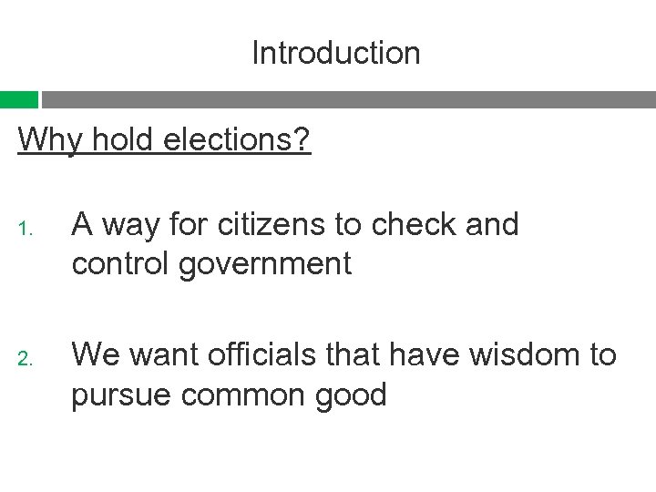 Introduction Why hold elections? 1. 2. A way for citizens to check and control government We want officials that have wisdom to pursue common good