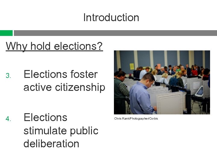 Introduction Why hold elections? 3. 4. Elections foster active citizenship Elections stimulate public deliberation Chris Rank/Photographer/Corbis