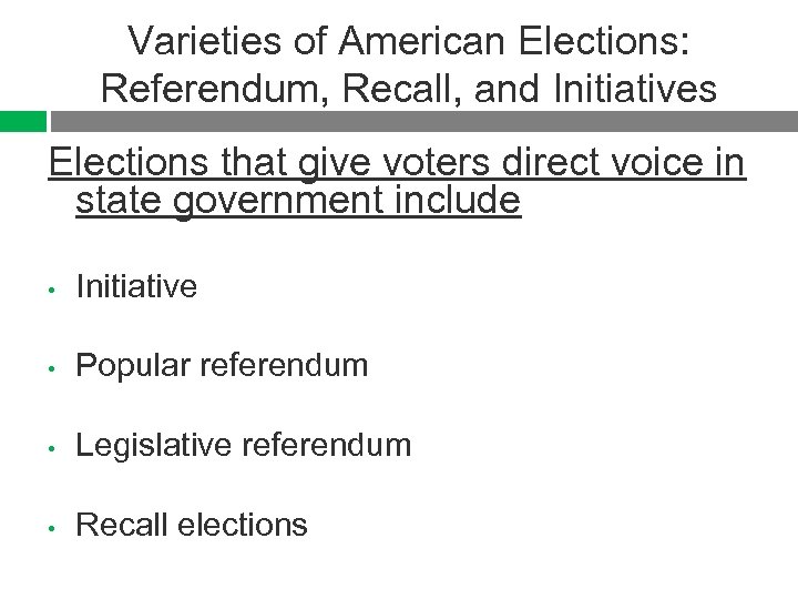 Varieties of American Elections: Referendum, Recall, and Initiatives Elections that give voters direct voice in state government include • Initiative • Popular referendum • Legislative referendum • Recall elections