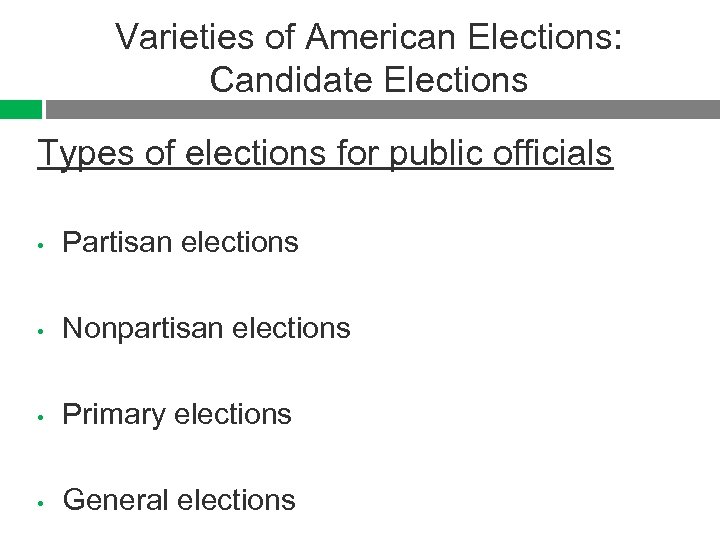 Varieties of American Elections: Candidate Elections Types of elections for public officials • Partisan elections • Nonpartisan elections • Primary elections • General elections
