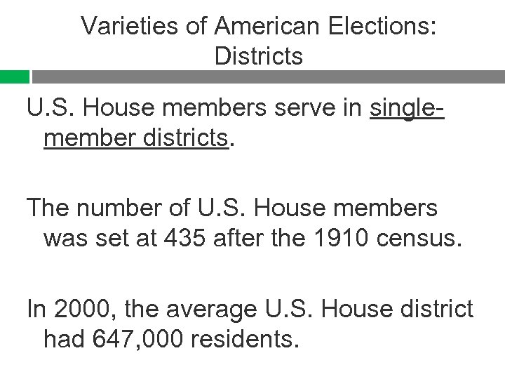 Varieties of American Elections: Districts U. S. House members serve in singlemember districts. The number of U. S. House members was set at 435 after the 1910 census. In 2000, the average U. S. House district had 647, 000 residents.