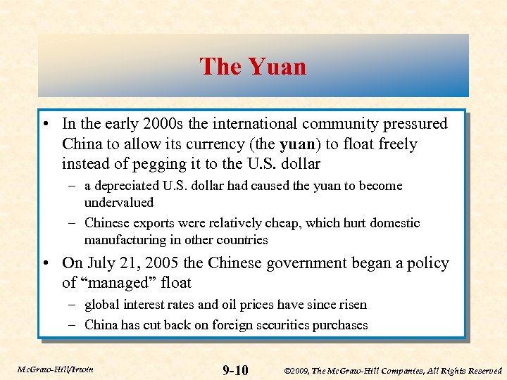 The Yuan • In the early 2000 s the international community pressured China to allow its currency (the yuan) to float freely instead of pegging it to the U. S. dollar – a depreciated U. S. dollar had caused the yuan to become undervalued – Chinese exports were relatively cheap, which hurt domestic manufacturing in other countries • On July 21, 2005 the Chinese government began a policy of “managed” float – global interest rates and oil prices have since risen – China has cut back on foreign securities purchases Mc. Graw-Hill/Irwin 9 -10 © 2009, The Mc. Graw-Hill Companies, All Rights Reserved