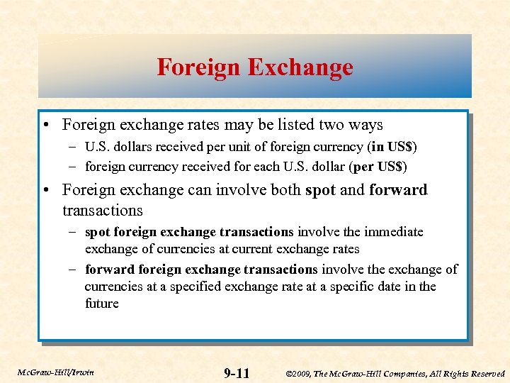 Foreign Exchange • Foreign exchange rates may be listed two ways – U. S. dollars received per unit of foreign currency (in US$) – foreign currency received for each U. S. dollar (per US$) • Foreign exchange can involve both spot and forward transactions – spot foreign exchange transactions involve the immediate exchange of currencies at current exchange rates – forward foreign exchange transactions involve the exchange of currencies at a specified exchange rate at a specific date in the future Mc. Graw-Hill/Irwin 9 -11 © 2009, The Mc. Graw-Hill Companies, All Rights Reserved