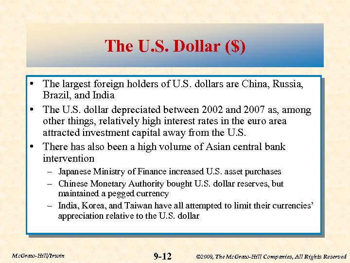The U. S. Dollar ($) • The largest foreign holders of U. S. dollars are China, Russia, Brazil, and India • The U. S. dollar depreciated between 2002 and 2007 as, among other things, relatively high interest rates in the euro area attracted investment capital away from the U. S. • There has also been a high volume of Asian central bank intervention – Japanese Ministry of Finance increased U. S. asset purchases – Chinese Monetary Authority bought U. S. dollar reserves, but maintained a pegged currency – India, Korea, and Taiwan have all attempted to limit their currencies’ appreciation relative to the U. S. dollar Mc. Graw-Hill/Irwin 9 -12 © 2009, The Mc. Graw-Hill Companies, All Rights Reserved