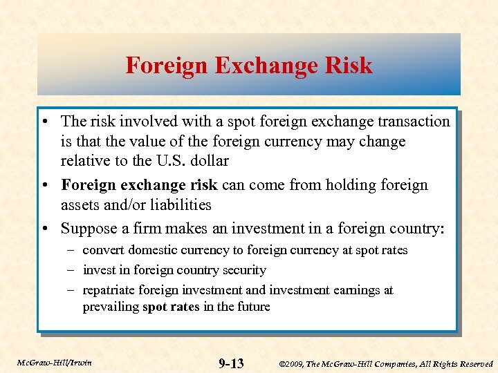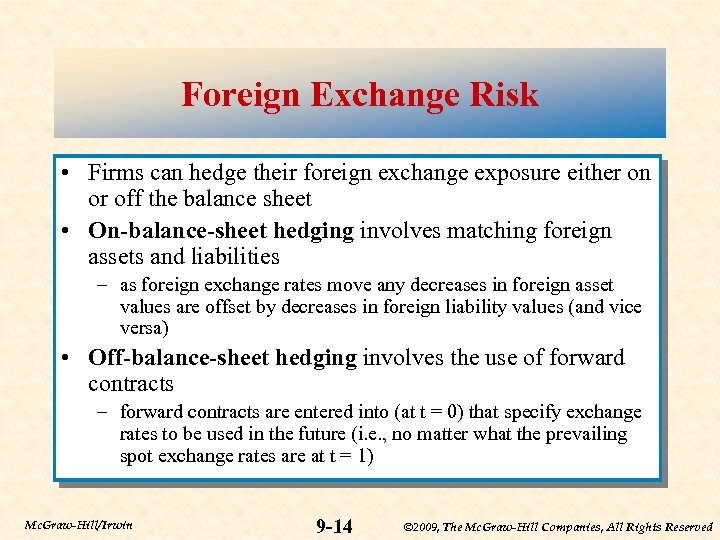 Foreign Exchange Risk • The risk involved with a spot foreign exchange transaction is that the value of the foreign currency may change relative to the U. S. dollar • Foreign exchange risk can come from holding foreign assets and/or liabilities • Suppose a firm makes an investment in a foreign country: – convert domestic currency to foreign currency at spot rates – invest in foreign country security – repatriate foreign investment and investment earnings at prevailing spot rates in the future Mc. Graw-Hill/Irwin 9 -13 © 2009, The Mc. Graw-Hill Companies, All Rights Reserved